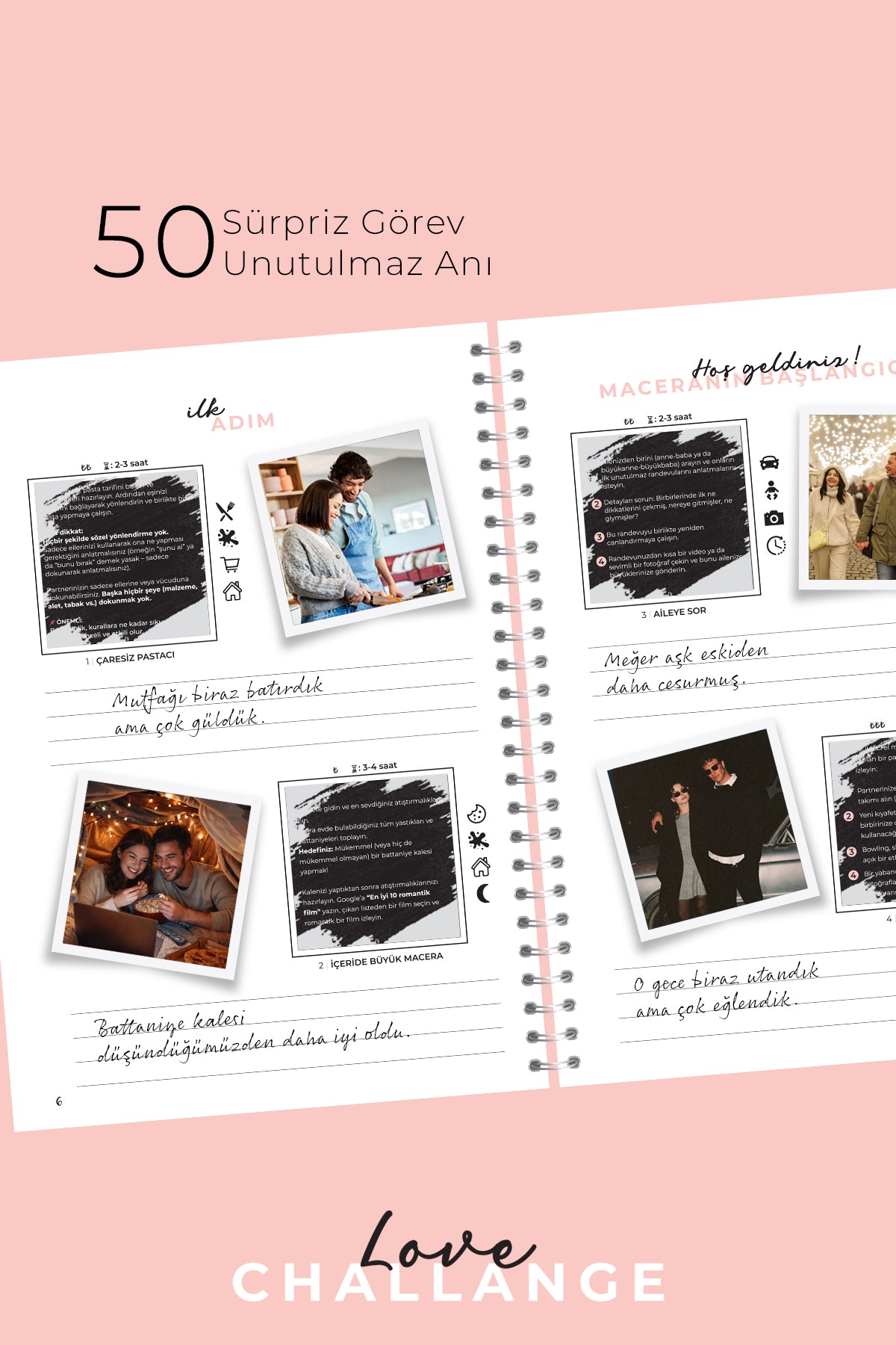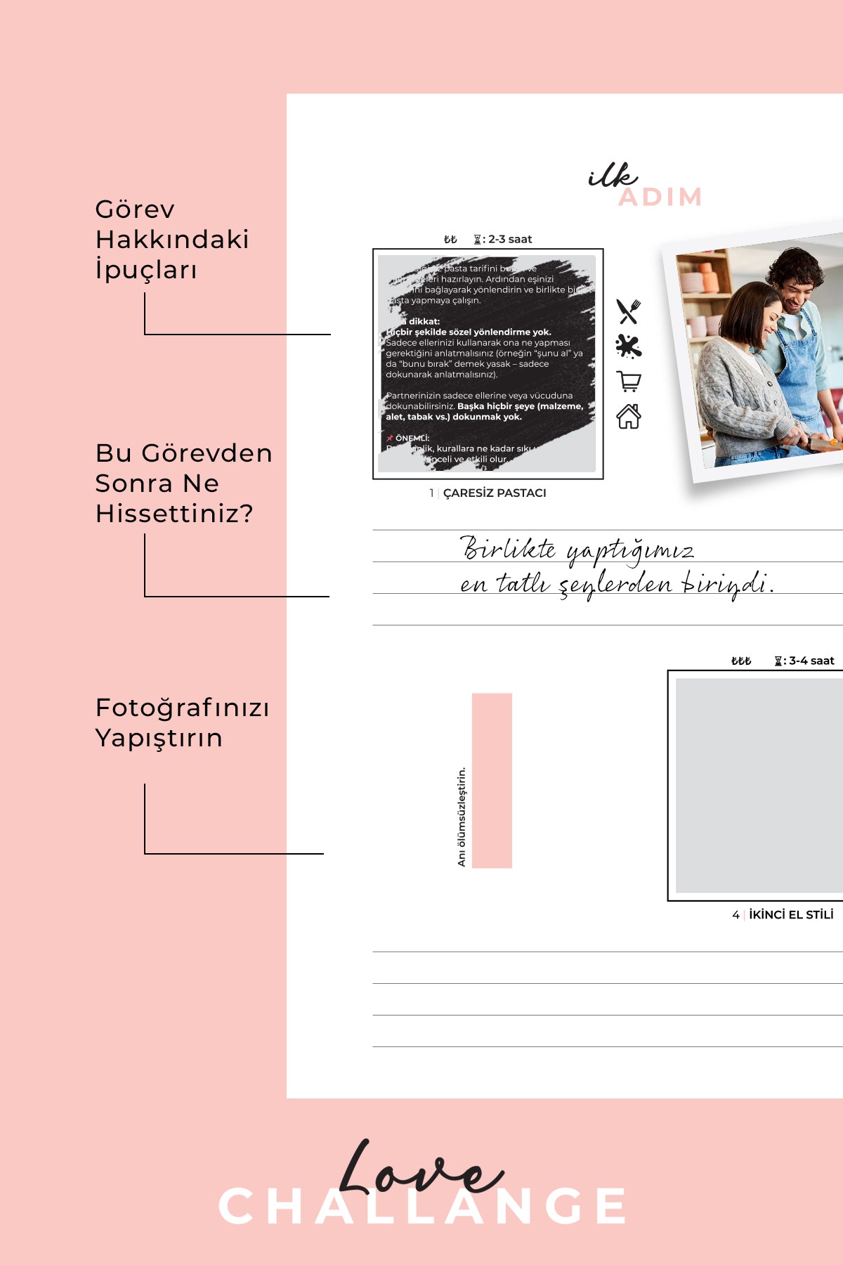 Görevlerin yanında o güne ait fotoğraflarınızı yapıştırabileceğiniz bir alan ve alt kısmında o günün nasıl geçtiğini yazabileceğiniz bir not bölümü bulunur. Böylece Love Challenge sadece bir etkinlik değil, zamanla ilişkinizin anı albümüne dönüşür.